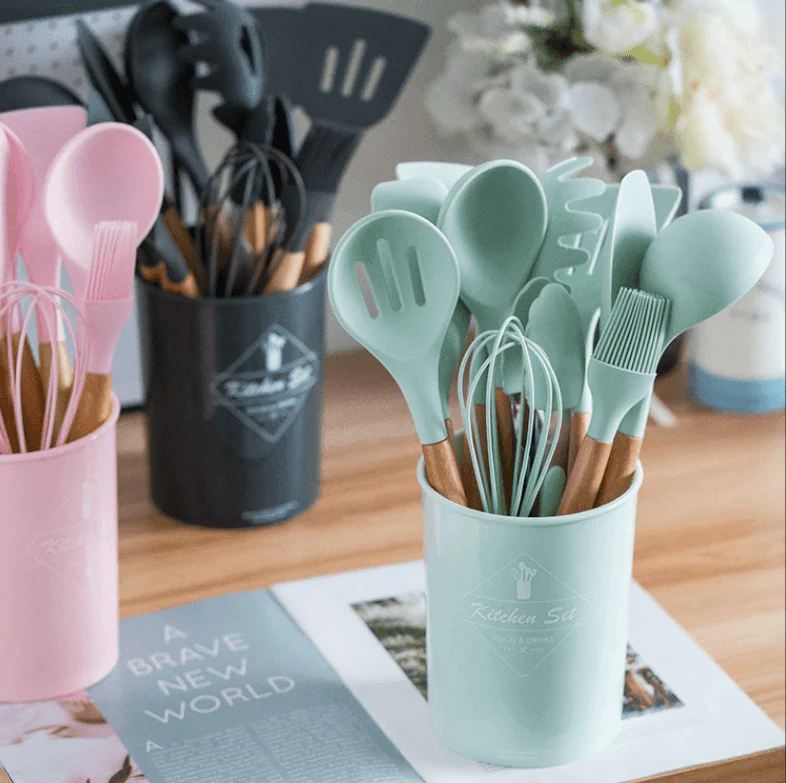 - About this itemNon-Stick and Protects CookwareSoft silicone head is strong and flexible, it won’t scratch or damage non-stick pans and pans like metal, you don’t have to worry about food sticking to your cookware. Easy to clean, perfect for protecting and extending the life of all your kitchen pots and pans.Food Grade Silicone: This kitchen cookware set is made of food grade silicone, which is BPA free and can be used for any type of food. They will not react with food or drinks, nor will they produce any fumes. You and your family can enjoy the process of preparing food with confidence.Heat and Scratch ResistantSilicone tips are super heat resistant up to 446F/230C, so you don’t have to worry about them melting after you accidentally leave them in the pan for a while. They are also scratch resistant and will last longer than other plastic kitchen utensils.Sturdy and Durable Wooden HandleHigh quality wooden handle will not bend or rust, which completely reduces the heat transfer during cooking and avoids burning your hands. Practical hanging hole design allows for convenient storage using hooks or wall hangings. Complete Cooking Set: Our 12 pieces of professional silicone kitchen utensils can meet all your daily cooking and baking needs, each tool has its own unique purpose. You don’t have to spend a fortune on each piece of cutlery separately to make it your own. Easy to use and versatile, it adds a splash of color to your kitchen. It can be given as a gift to anyone who loves to cook and is an ideal gift for friends and family at Christmas, Thanksgiving, weddings, and housewarming parties.