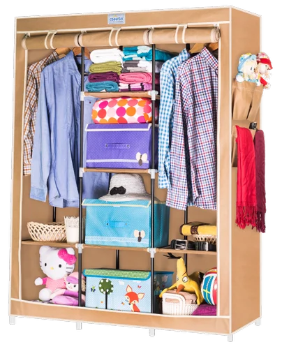- This portable wardrobe is a great storage unit to keep your bedroom neat and tidy. Need extra space for your clothes? This double wardrobe with non-woven cloth cover is an absolutely ideal solution for storing clothes, shoes, books, toys and more! Perfect for any bedroom and comes with a non-woven cloth cover that not only offers a great look but also a fabulous way to hide any unsightly mess.