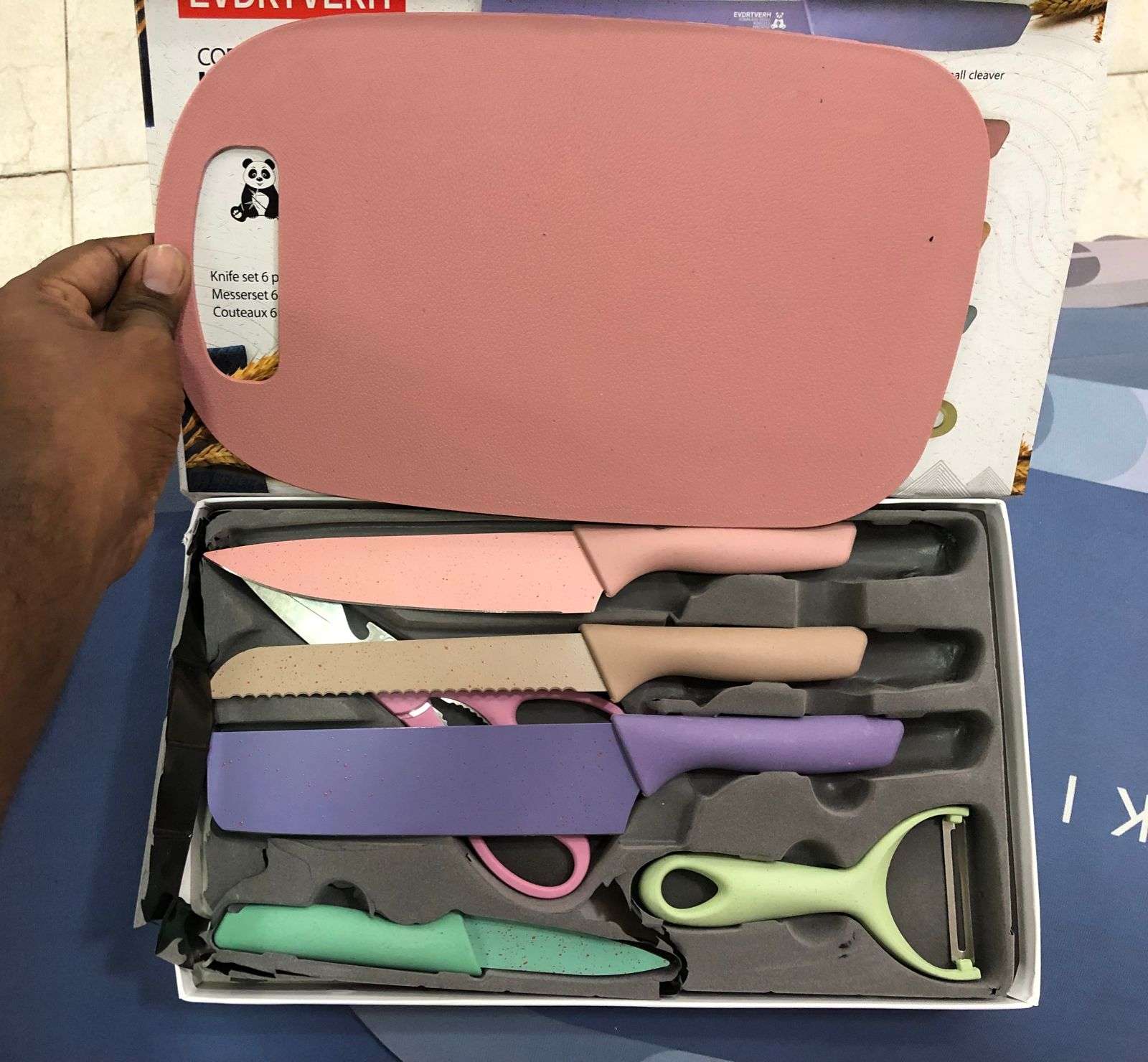 The colorful knife set includes 1 x 7” Cleaver knife, 1 x 7″ Chef knife, 1 x 7” Bread knife, 1 x Paring Knife, 1 x Peeler, 1 x Scissors. This multifunctional colorful knife could meet for all different in your daily life.