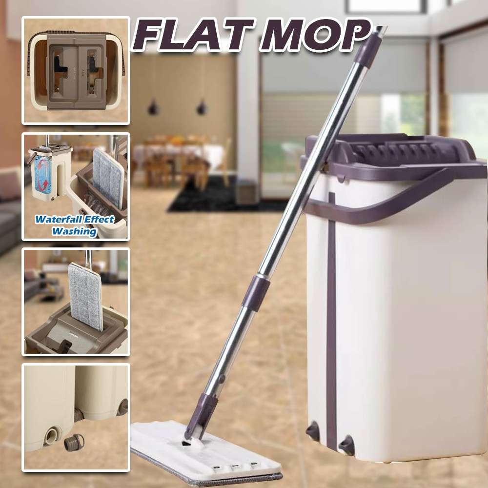 - [MOP BUCKET SET] Flat Squeeze Mop Bucket Set. Self cleaning mop, SAVE your time and labor, let the bucket do more than by yourself, mopping is just between mop and bucket, be free from dirty water, All you need to do is inserting and pulling the mop.