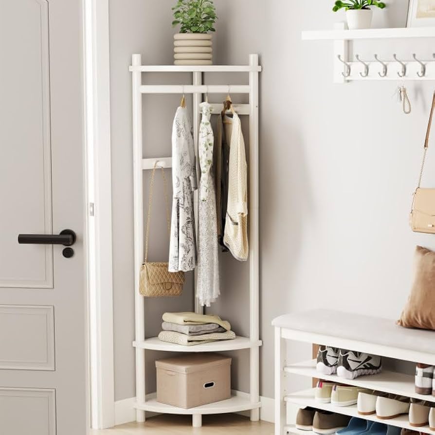 Solid Wood Corner Coat Rack with Hanging Clothes Rod, 4 Hooks Corner Hall Tree with Storage Rack, Corner Clothes Rack for Bedroom Entryway (White)