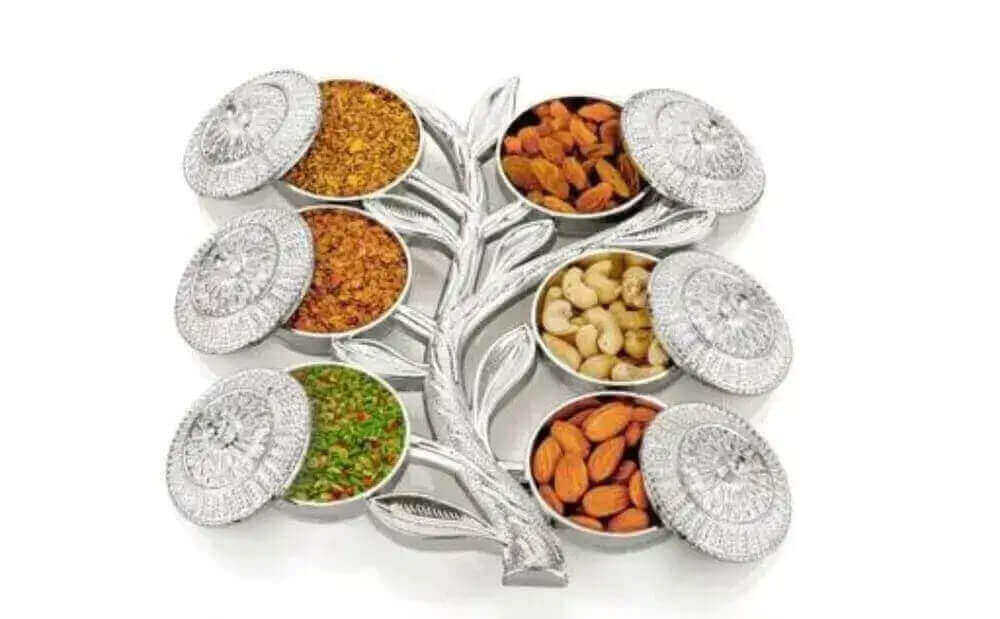 Multipurpose Tree Shape 6 Storage Silver Mukhwas Dani Box Gift Set for All Occasions for Home, Festivals/Corporate/Functions/Wedding/Housewarming/Return Gift and home use for all Occasions. Plastic Multipurpose Tree Shape 6 Storage Silver Mukhwas Dani Box Gift Set for All Occasions with Customized Gifting Purpose Navratri, Dussehra, Diwali Festivals, Corporate, Functions, Wedding and for all Occasions, for Home, Office, purpose available with Good Quality.